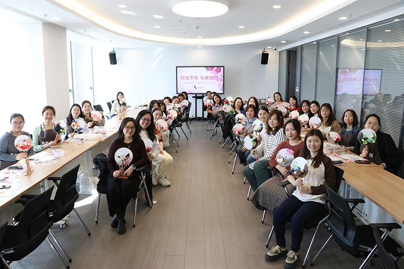3月8日,工會組織女職工開展“時光不負、與美相約”—國潮古風文化團扇DIY活動。來自各部門的女職工們圍坐在一起,融合創意、交流構思,將象征著永不凋謝的美好的永生花與團扇結合,在親手制作中感受古風之美,在談笑盈然間增進友誼,讓大家在感受美、欣賞美、創造美的過程中度過一個愉快的婦女節。