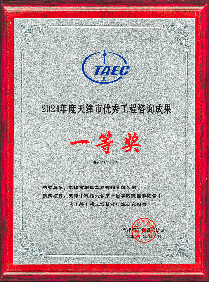 近日,在天津市工程咨詢協會第五屆五次會員大會暨第五屆理事會第五次會議上,天津咨詢所屬宏亞工程咨詢有限公司編制的《天津中醫藥大學第一附屬醫院國家醫學中心(籌)建設項目可行性研究報告》榮獲2024年度天津市優秀工程咨詢成果一等獎,同時被授予2025年度優秀會員單位榮譽稱號。